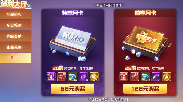 两张月卡可同时激活,持续30天,获得20倍、25倍超级返利,买了就赚