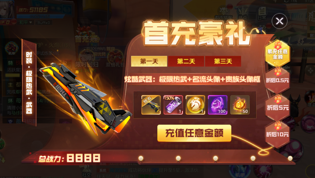 首充任意金额获取唯一极限热武+经验加成药剂