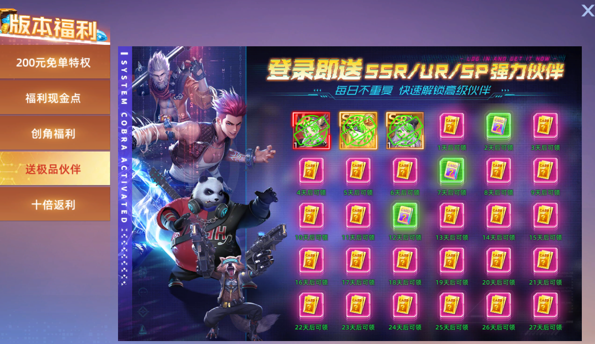4、前30日登陆免费领取高级伙伴,五、十、十五天更可获取强力SP伙伴